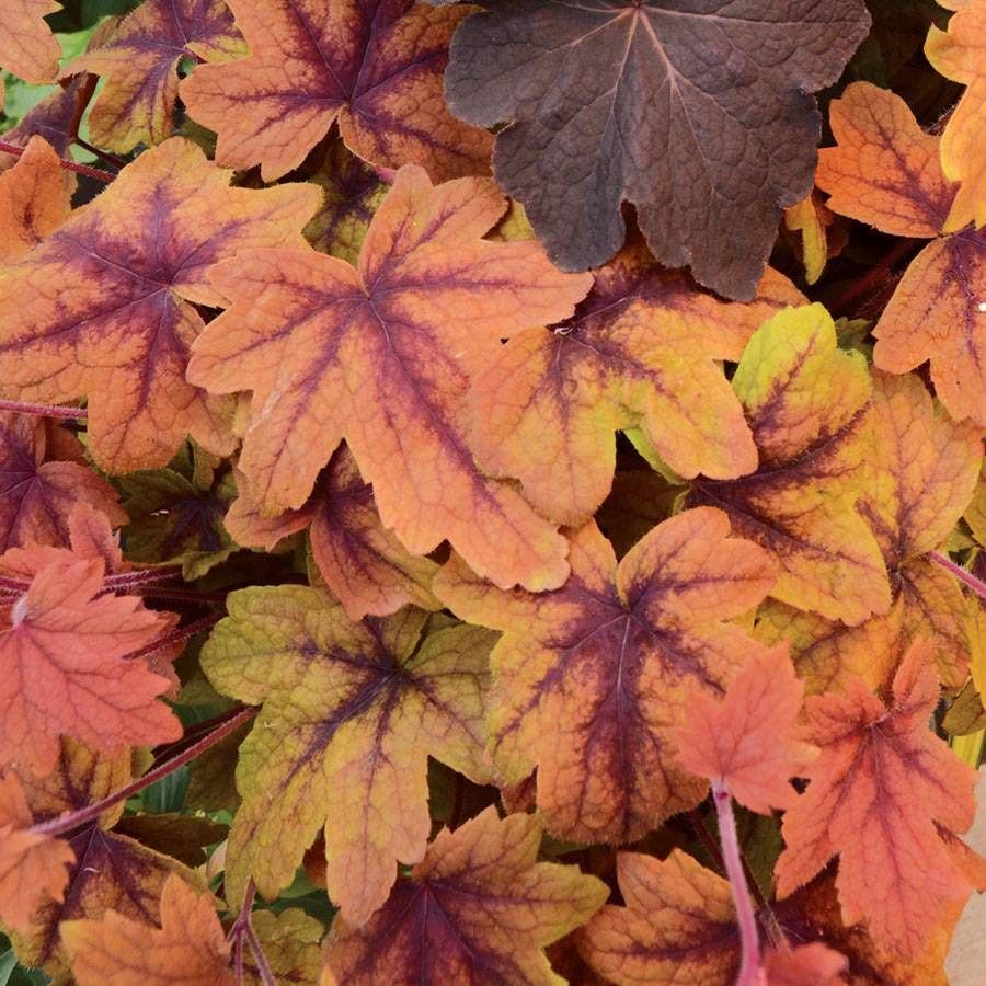 Colorful heucherella are nothing new, but the play of oranges and browns on these leaves introduces an entirely new palette to the family. And the colors just become darker and more vibrant in summer heat and humidity. With Heuchera villosa in its parentage, Heucherella 'Sweet Tea' stands up effortlessly even to the punishing summers of the South and Southwest, keeping its densely layered, mounded form and improving its already brilliant hues. There's simply nothing else to compare Heucherella 'Sweet Tea' to.