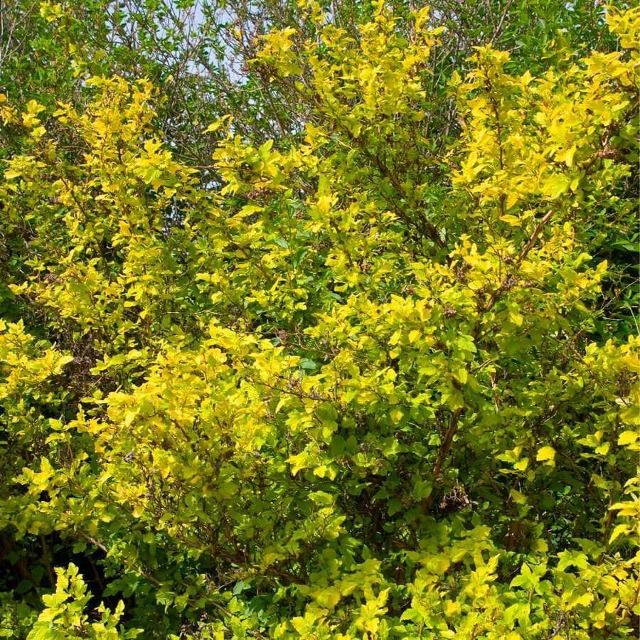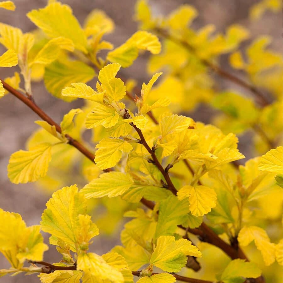 The pollen parent of P. opulifolius 'Center Glow', 'Dart's Gold' is a highly colorful, compact, mounded ninebark cultivar that provides the garden with 3 seasons of interest. This spreading deciduous shrub, closely related to genus Spiraea, blooms in spiraea-like clusters of small, spherical, pink-tinged white flower "buttons" set against maple-like bright golden yellow leaves in late spring. The foliage matures to chartreuse by midsummer, gradually turning yellow with bronze tinting in fall. Fairly concealed most of the year, the reddish to light brown exfoliating layers of bark on mature branches add winter interest.