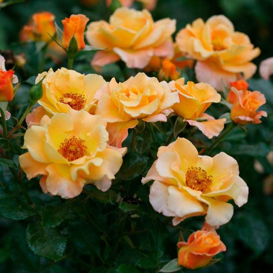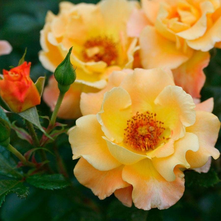Rosa Suñorita™, a floribunda shrub rose, is a deciduous perennial shrub offering three seasons of interest. Long and continuously blooming, this rose sets elegant, classically shaped red-orange buds on new wood that open into distinctive deep peach and orange sherbet-colored flowers from early summer through frost. The blooms have petals in an even, double whorl; and as the blooms age, they develop a golden tone. Borne in clusters, the lightly sweet-scented, ruffled blooms repeat rapidly, attract bees to the garden, and make lovely bouquets or additions to floral arrangements.