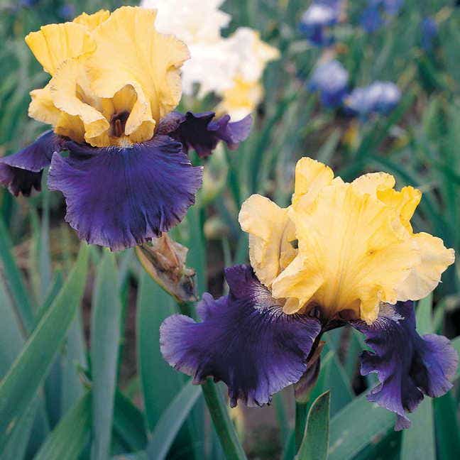 For a spectacular display, plant Iris 'Jurassic Park' bulbs in the late summer through fall, and witness a burst of beauty in mid-spring to early summer, with an encore performance in late summer to early fall. This heavily blooming tall bearded iris takes center stage, adorning the garden with its dramatic, ruffled, bicolored flowers. Canary yellow standards harmonize beautifully with blended lavender-blue falls, featuring yellow veining and edging. Adding to the allure, a slight sweet scent accompanies these blooms, which are borne on tall, sturdy scapes above sword-shaped blue-green leaves that maintain a fresh appearance throughout the season. Beyond their visual appeal in the garden, the flowers draw in pollinators, especially butterflies and hummingbirds, and serve as elegant, long-lasting additions to spring bouquets.
