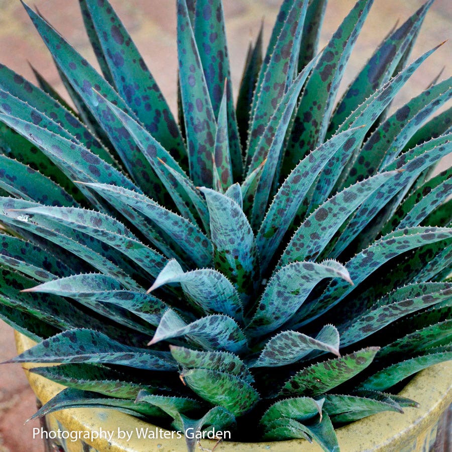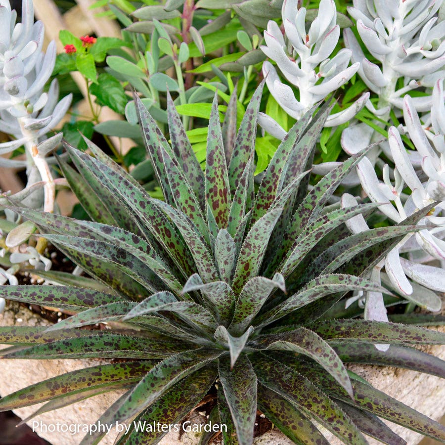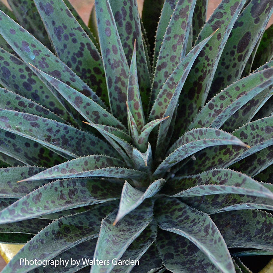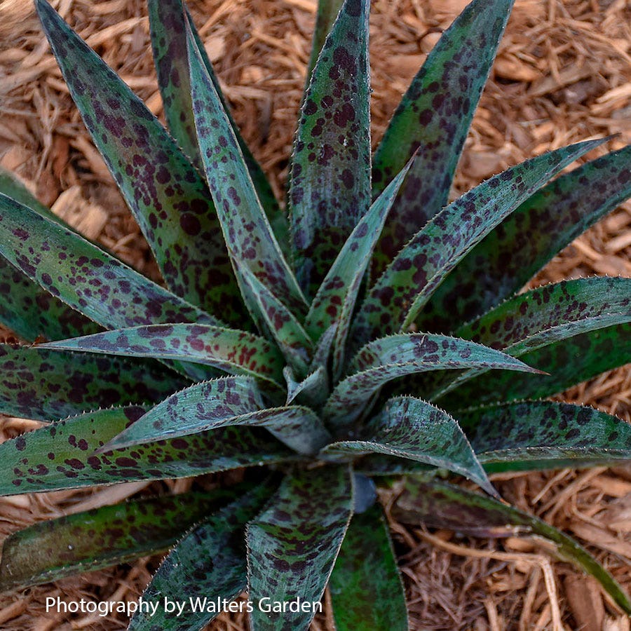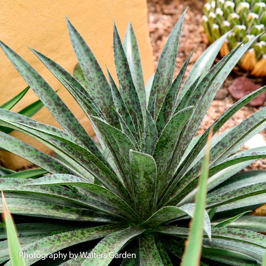 Mangave 'Pineapple Express,' a member of the MAD ABOUT MANGAVE® collection, and a succulent herbaceous tender perennial, is prized for its exceptional spiky rosette of long, stiff, slender foliage that artfully resembles the top of a pineapple. The medium green leaves are adorned with heavy burgundy speckling, cinnamon spines on the margins and tips, and a waxy coating, presenting a mint-green finish that adds to its allure.