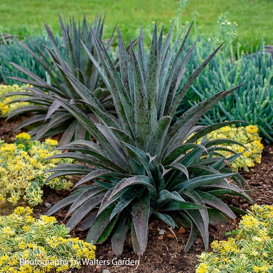 Mangave, born from the intergeneric cross of Manfreda x Agave, seamlessly combines the superior growth rate and fascinating patterns of Manfreda with the refined habit of Agave. 'Pineapple Express' grows at a moderate rate and matures into a compact plant that makes an outstanding specimen in a small-space garden. It shines in rock, alpine, and waterwise gardens as well as in xeriscapes. Beyond its garden prowess, this mangave excels as a container plant, suitable for both indoor and outdoor settings. For regions grappling with cold winters, a move indoors is recommended, where temperatures above 60°F can be maintained.