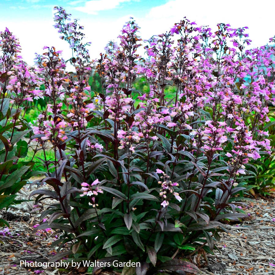 Penstemon 'Blackbeard', an exceptional perennial plant, is prized for its striking foliage and flowers that bloom from early to midsummer when its tall stems burst into a spectacle of lilac purple blooms with contrasting white tubes. These beautiful flowers sit atop a mound of eggplant-purple leaves that remain upright and stunning throughout the season. The nectar-rich flowers are a magnet for pollinators, including bees, butterflies, and hummingbirds, adding a lively touch to your garden, while the dark burgundy seed pods that follow extend the plant's appeal into the later seasons. The flowers also make excellent bouquets or additions to any floral arrangement.