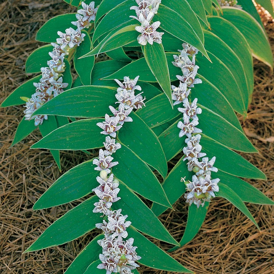 A delightful surprise in the shady garden, Toad Lily Miyazaki offers exquisite blooms that resemble exotic orchids, borne all along the spine of symmetrical, arching 3-foot stems! Looking more like a painting than a hardy perennial, this Toad Lily blooms in October, when little else in the garden is colorful, its remarkable foliage and flowers forming the central point of any garden spot where it is located. 'Miyazaki' has orchid spotted flowers along arched stems! An excellent and floriferous flower to add to your garden.