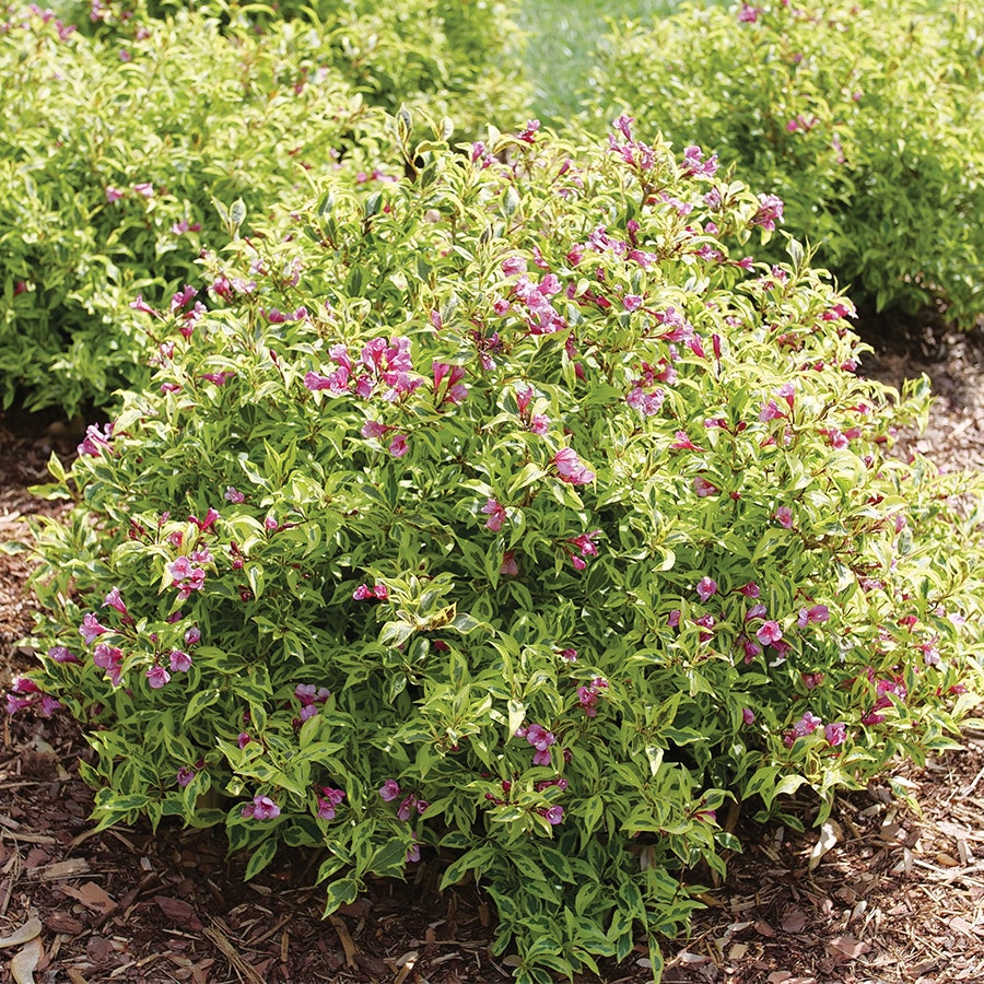 A Proven Winners® ColorChoice® Flowering Shrubs variety, Weigela Bubbly Wine™ is a deciduous shrub offering 3 seasons of interest. Mainly grown for its variegated foliage, the petite plant has small, brightly colored leaves in hues of yellow, green, and burgundy. Although occasional reversions occur (like in all variegated plants), this shrub has been quite stable. After the leaves have emerged, Bubbly Wine blooms in late spring to early summer. The small bell-shaped pink flowers freely bloom, attracting pollinators, including hummingbirds.