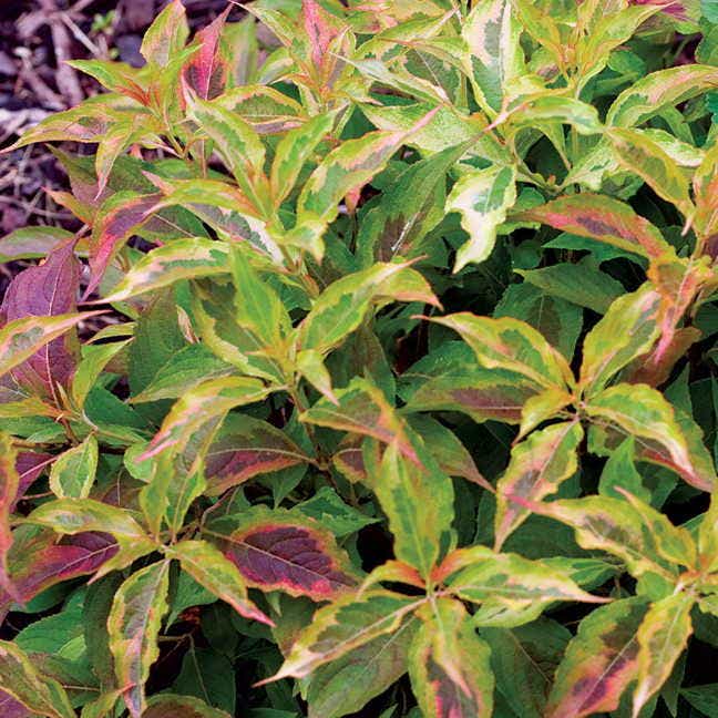 Although this beautiful dwarf Weigela fills the spring garden with dark pink blooms, it is primarily grown for its foliage. Every leaf sports bands of green, pink, and yellow, making My Monet® Sunset stand out magnificently in the sunny garden or container. There is no more beautiful shrub for multi-season interest!