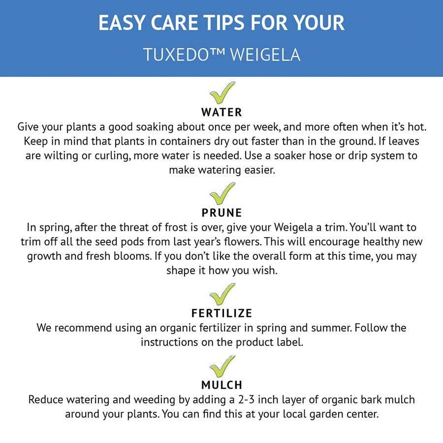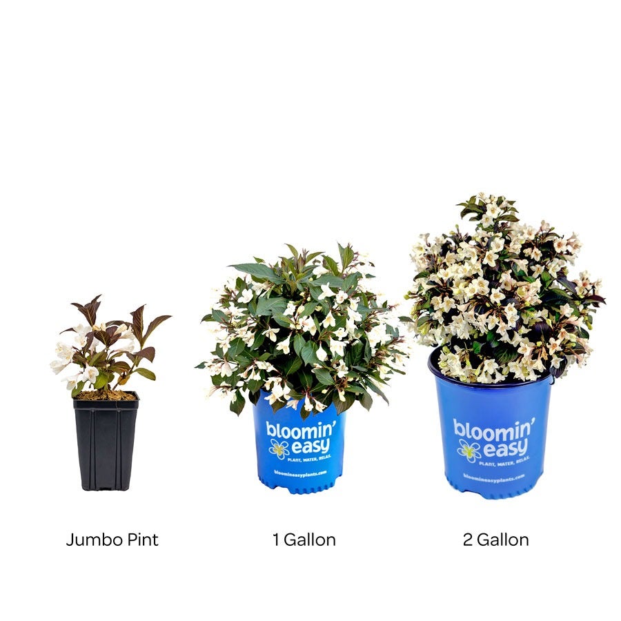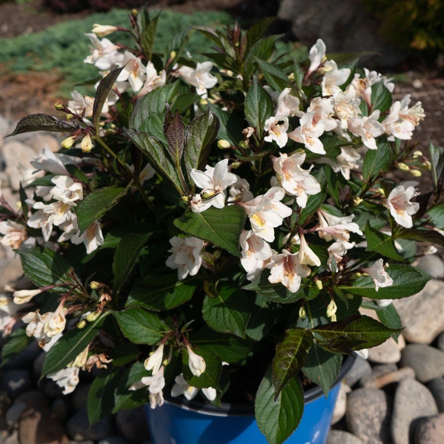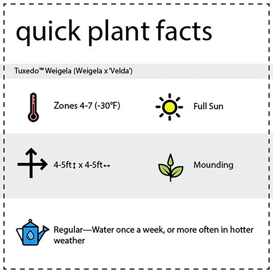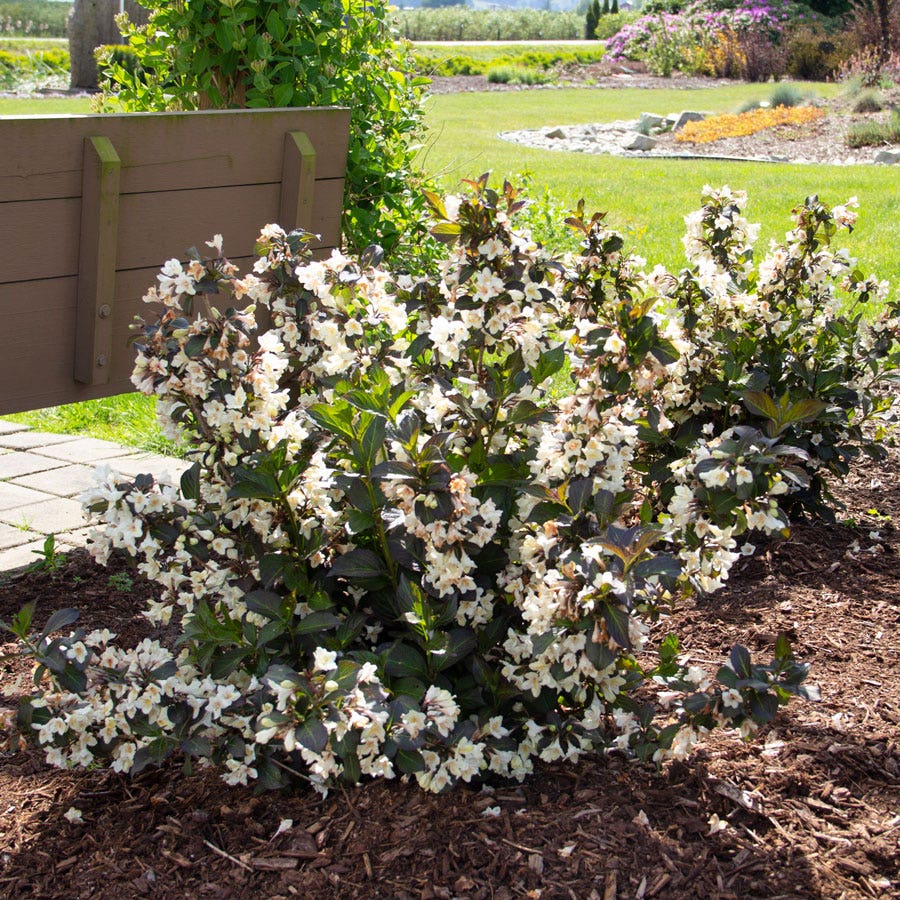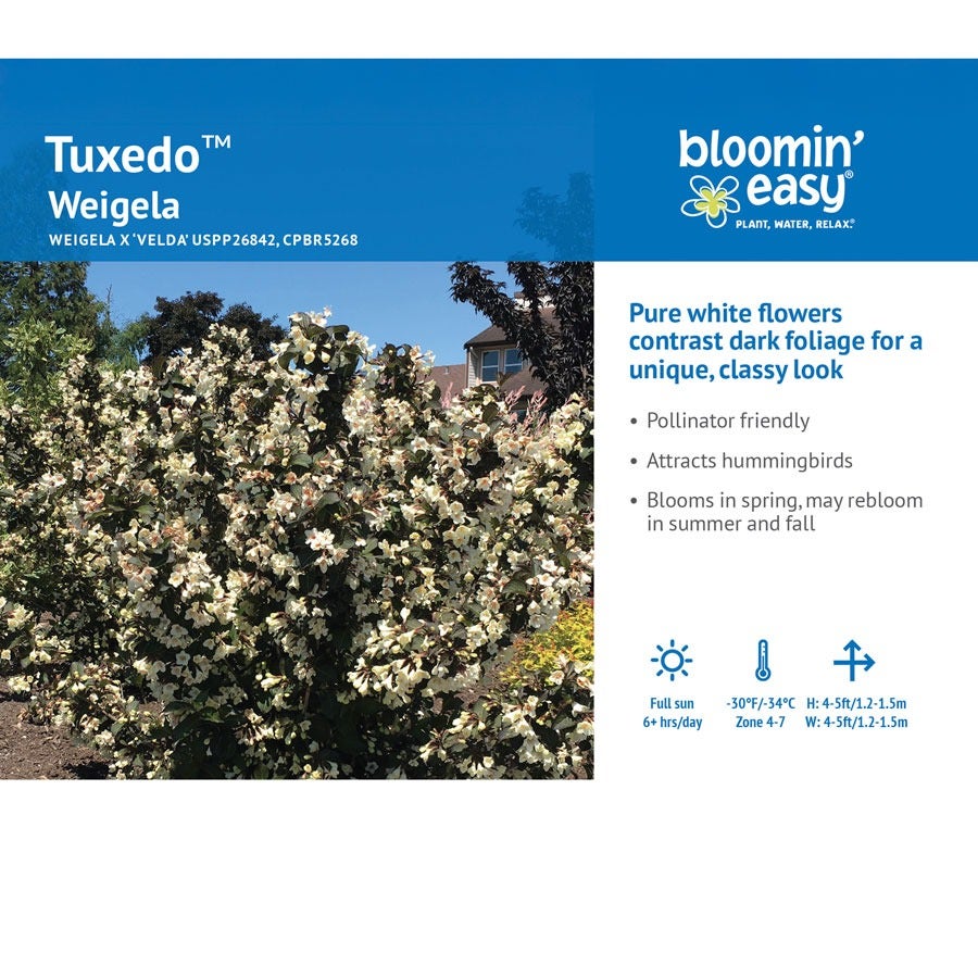 With all the color and class of a baby grand piano, Weigela Tuxedo™, a Bloomin' Easy® variety, will slide into your garden and steal the show. Small, bell-shaped ivory blooms flourish over this dashing shrub like drops of cream in black coffee and its leaves are the darkest shade of green you've ever seen when in full sun. Blooming late spring to early autumn, this shrub has lasting appeal and is even cold hardy into Zone 4. Place this darling bush in plenty of sunlight and it will reward you with dazzling flora and a tidy mounded habit. This easy to care for mound-shaped shrub does best in full sun and works great as some darker color in flower beds. If you're looking to add distinct elegance to your garden space you can't go wrong with a sharp 'Tuxedo'.