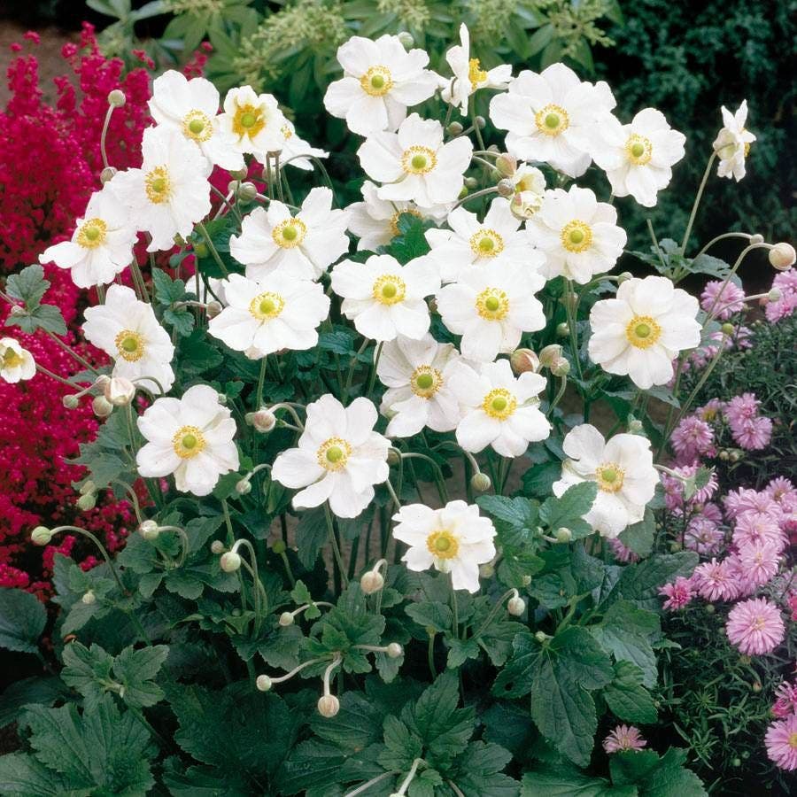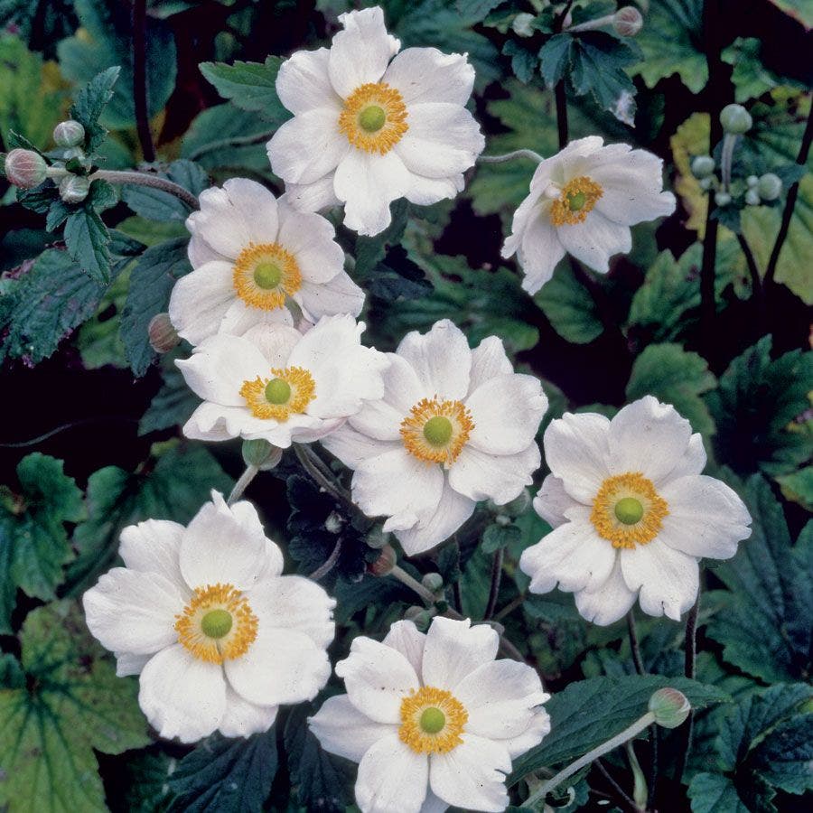 This beloved fall-blooming perennial lights up the partly shaded garden with clean white blooms sporting buttery centers. Bobbing atop long, slender stems held well above the neat 12-inch mound of foliage, this superb cutflower is also a garden standout, adding a lightness and cottonball softness to the perennial border just when the garden needs color most desperately!