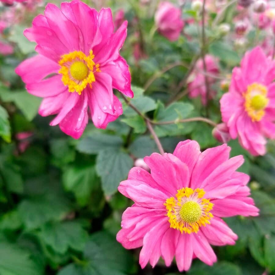 Anemone plants are commonly called windflowers for their flowers that gently sway in the breeze. This windflower's double rosettes of broad overlapping deep rose-pink petals and frilly golden stamen ring arise on long, slender, wiry stems in late summer and fall and persist freely and continuously for weeks.