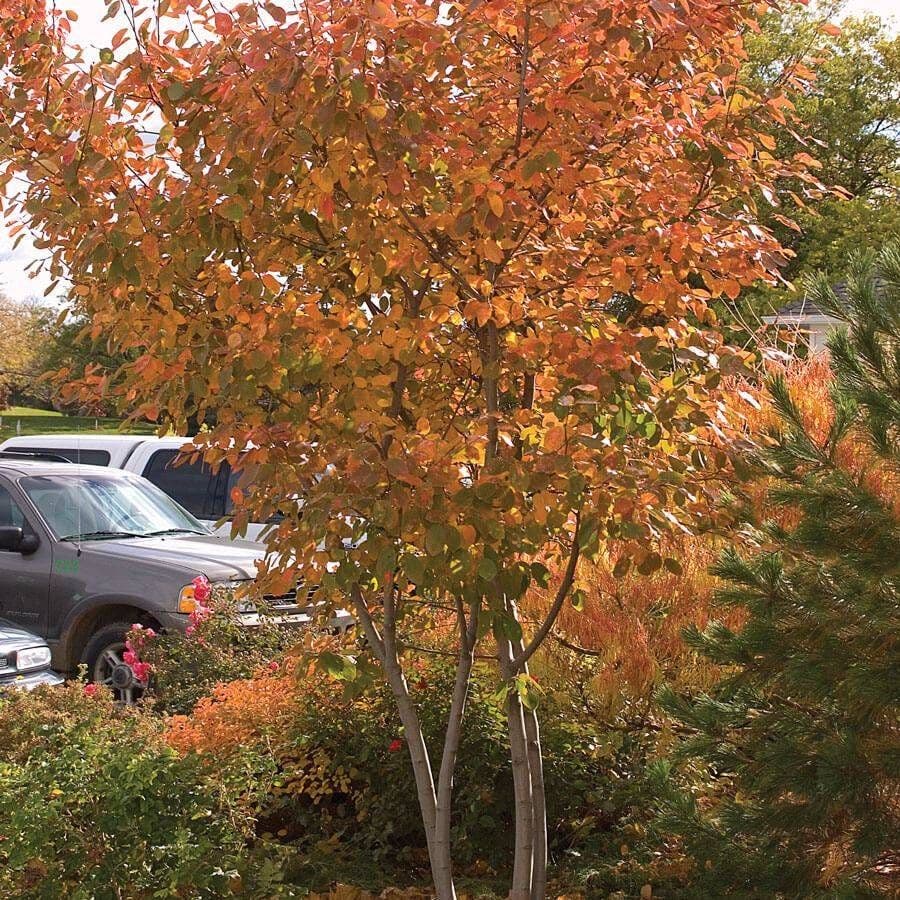 The spectacular white flowers on this apple serviceberry are the largest of all the amelanchiers. Borne in early spring, the emerging blooms are pink tinged, fading to white with age. The blooms attract bees and are followed by berries that attract birds. Young finely toothed leaves are purplish in spring, mature to dark green throughout summer, and turn brilliant shades of yellow, orange, and red in fall.