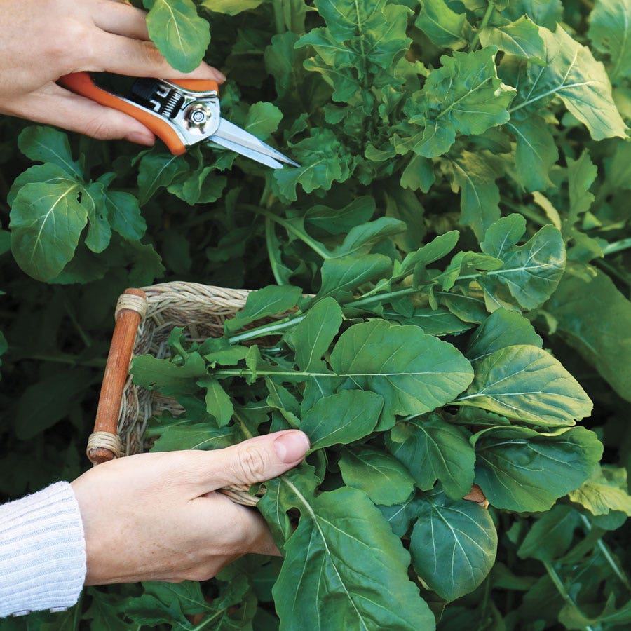 This plant reaches about 2 1/2 feet tall and 1 foot wide, with leaves best cut at 2 to 3 inches long. Cut just what you need for the next meal; each leaf that is severed stimulates production of more foliage, so a single plant can keep producing over a long season. And the flavor is so delectable when the leaves are young and tender—peppery and mustardy, with a palate-cleansing zing! Great in pesto, too—just don't let the leaves get too big, because they will lose their tender texture with maturity.