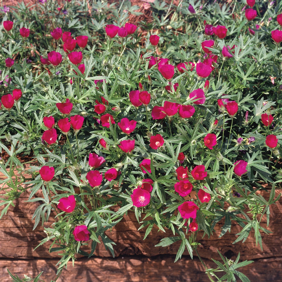 These blooms are magnificent, so richly colored they appear to glow, and borne profusely above the large, lobed dark green foliage. Measuring 2 1/2 inches wide, they are equally as deep, with a small white-to-yellow center and a nicely cupped shape that gives them their common name of Poppy Mallow. Always the brightest flowers in the garden, they carpet the sunny landscape in unforgettable jewel-like tones!
