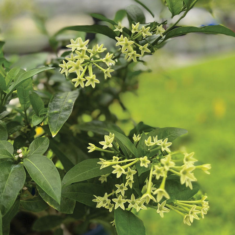 Cestrum Night Blooming Jasmine is a bushy evergreen shrub offering year-round interest, blooming repeatedly throughout summer. Opening at night, closing during the day, the slender, tubular, creamy white flowers are borne on gracefully arching stems and bloom in abundance, emitting a strong, sweet fragrance, enticing bees, butterflies, and hummingbirds. Clusters of small white berries follow, attracting birds.
