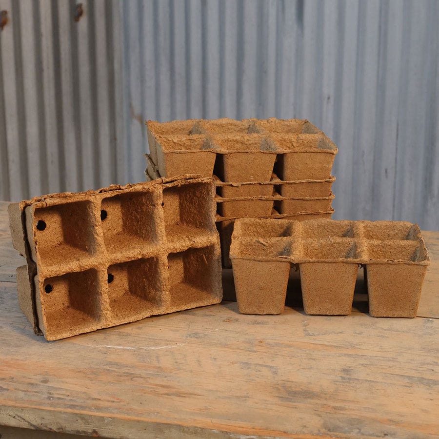 - Description / CowPots 3-inch Biodegradable - Pack of 10 (6-packs)- The all-natural seedling pot. - This is our new favorite pot, hands down. The good folks at CowPots have found a way to create a win-win product that works great and does great things for our gardens and our planet. CowPots are post-methane manure planters that break down completely into the soil, enriching it with nitrogen and enabling plant roots to spread freely as they grow. - Made on a dairy farm in Connecticut, these pots begin as cow patties from the resident herd. Then the methane is extracted and used as fuel to power the farm buildings. What's left is separated into liquids (which go right onto the crops at the farm) and solids, which continue to compost until being molded into CowPots. By this time they are odor-free, and because they have not been mixed with other materials, they are free of weed seeds and other debris. Nitrogen-rich and porous enough to let roots grow through and air circulate, they are the perfect container medium for seeds and seedlings. - To use CowPots, simply fill with your choice of potting soil, then plant the seeds, root the cuttings, or transplant the seedlings. Place the CowPots in a tray as you would a peat pot, so that drainage can run off. Then give the seeds or plants heat and light (if starting indoors in a cool room) and wait to see shoots. - The only difference between CowPots and standard peat pots or plastic pots is that the manure tends to retain moisture, so don't overwater. And if you can space multiple 6-pack cells of CowPots an inch or so apart in the tray, rather than butting right up against each other, you will get better air circulation. But these are detailsthe CowPot behaves just like any other small pot until planting time. - When it's time to plant out, simply set the whole pot into the soil. You don't have to tear or crack the sides of the pot like many of us have learned to do with peat pots, to help the roots find their way out. And while peat pots can often take several seasons to break down, nitrogen-rich CowPots begin biodegrading immediately, and are completely integrated into the soil within 3 months. Best of all, there is no transplant shock associated with plants grown in CowPots and then transplanted into garden or container. - So: as your plants grow, CowPots are feeding the soil with nitrogen, a nutrient it craves. There is no mess, no transplant shock, no worry about whether the roots can really "grow through" those compressed peat walls. All you have is a fully integrated plant, better soil, and a good feeling about how you've used only a 100% renewable resource as a planter. Peat bogs are in finite supply, but cows are chewing cuds right now to make us more CowPots. - Please give these innovative containers a try this season. We can almost guarantee you will be so delighted with them, you'll be back for more in no time. - Each of the 6 cells within that flat is 2⅛-inches in diameter at the base, tapering outward to 3-inches in diameter at the top. You get 10 6-packs, or 60 pots in all.