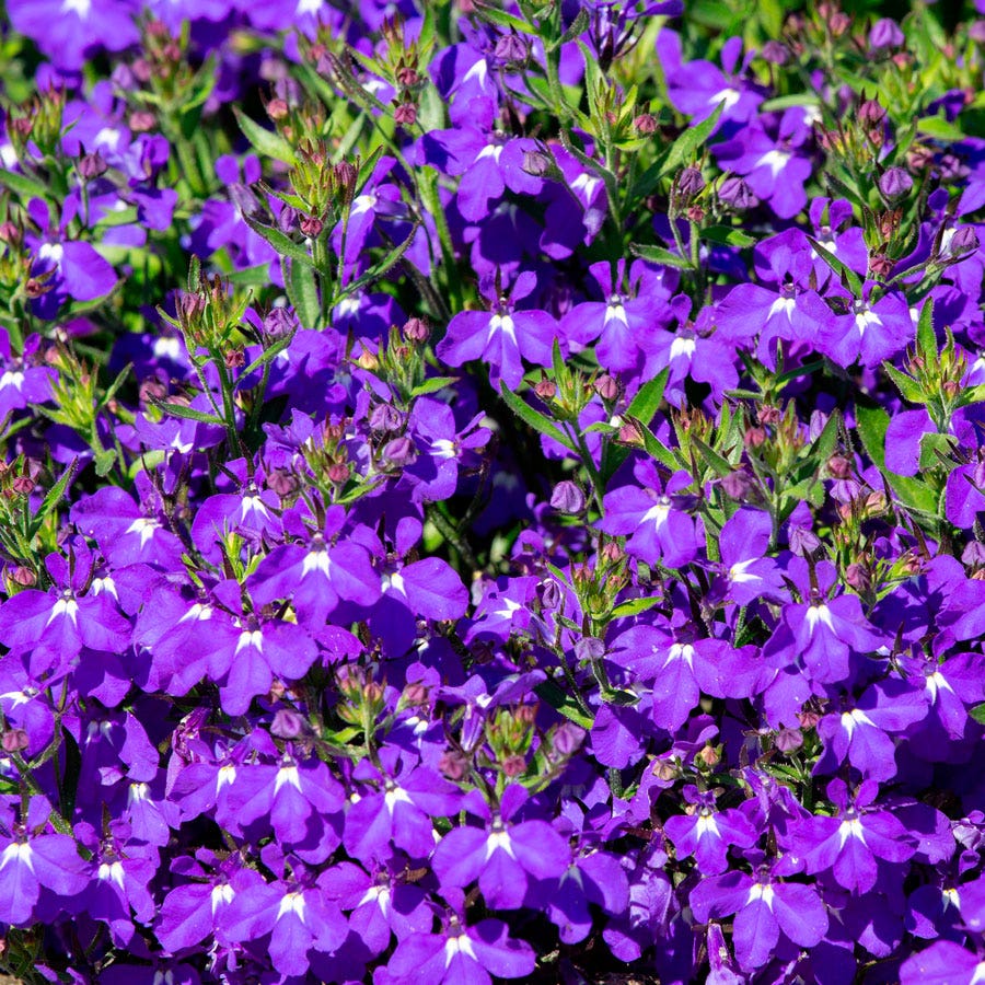 A Lobelia erinus, a highly popular traditional garden favorite, Crystal Palace has an upright, compact, bushy habit of narrow, bronze-tipped green leaves. It is shown to best effect grouped or massed as it forms a low cushy mat of intensely colored blooms. Lobelia is perfect for rock gardens, beds, border edges, and containers.