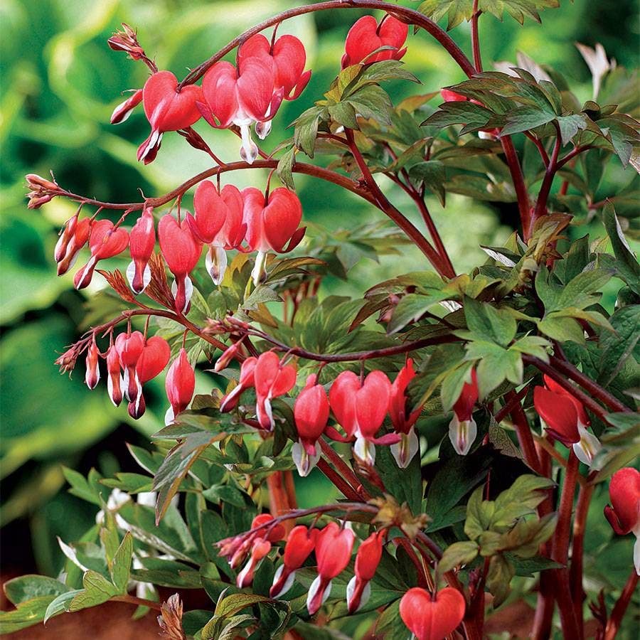 Perfect strings of red-and-white valentines dangle from these dark red stems in late spring, beautifully formed, nicely puffed, and so neatly arranged. A classic look in bleeding heart, Valentine® is an essential part of the spring show in your shade border . . . and that's even without its purple-flushed foliage.