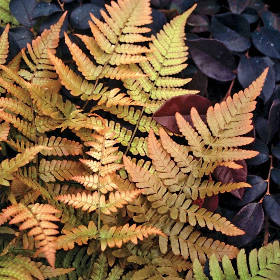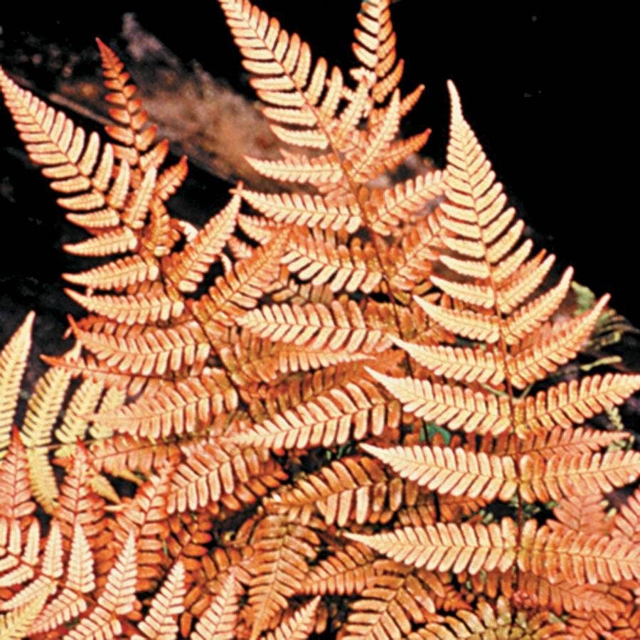 These long, elegant fronds unfurl in spring a deep orange to copper shade, keeping their hue until the hot weather of summer gradually turns them green. Then in autumn, they burnish bright copper again. 1½ to 2 feet long, they are truly eye-catching in any setting, from a single plant among the hostas and heucheras to a big sweep of color in hard-to-fill dry shade.
