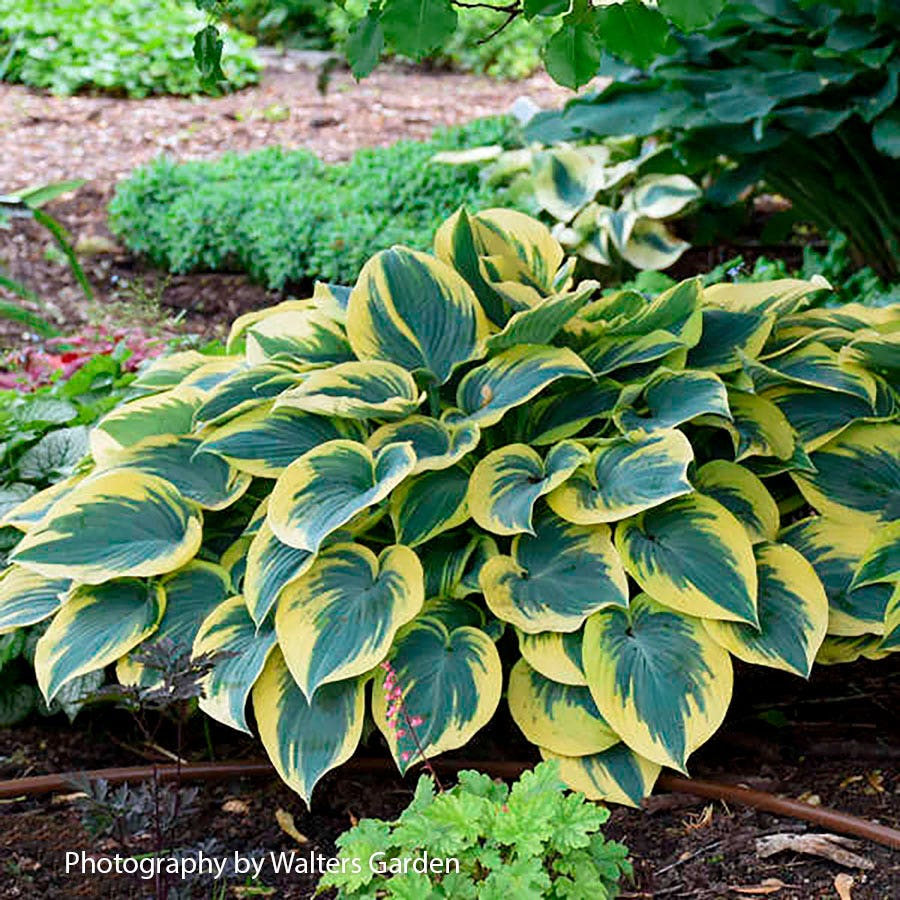 A Hosta hybrid, commonly called hosta or plantain lily, Hosta 'First Frost' is a rhizomatous plant with a symmetrical, mounding habit and a medium growth rate. Hosta is a highly versatile plant, shown to best effect when grouped or massed in beds and borders. But it also makes a lovely specimen or container plant as well as nice edging.