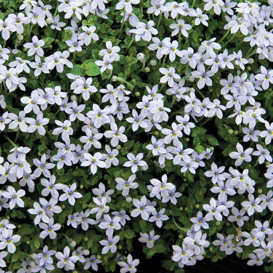 Originating from Australia, this variety of Isotoma fluviatilis, also known as blue star creeper, Laurentia, and swamp isotome, grows at a moderate pace, spreading out in a low, dense carpet. It's an excellent choice for underplanting, erosion control, and can withstand foot traffic, making it perfect for path edges and spaces between stepping stones. Its resilience also makes it a suitable replacement for turf lawns in temperate climates. But blue star creeper also shines as a bedding plant, and its cascading charm enhances the appeal of containers and hanging baskets.