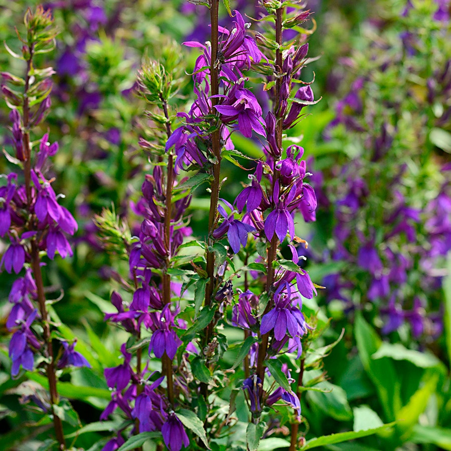 This cardinal flower's sturdy spires brimming with butterfly-shaped, very nearly true-blue blooms aloft vibrant green foliage produce a powerful impact in a small space. Its stunning appearance and columnar form make it a popular choice for a garden border, but it mixes well with annuals and perennials. The flowers are also a fun addition to cut bouquets.