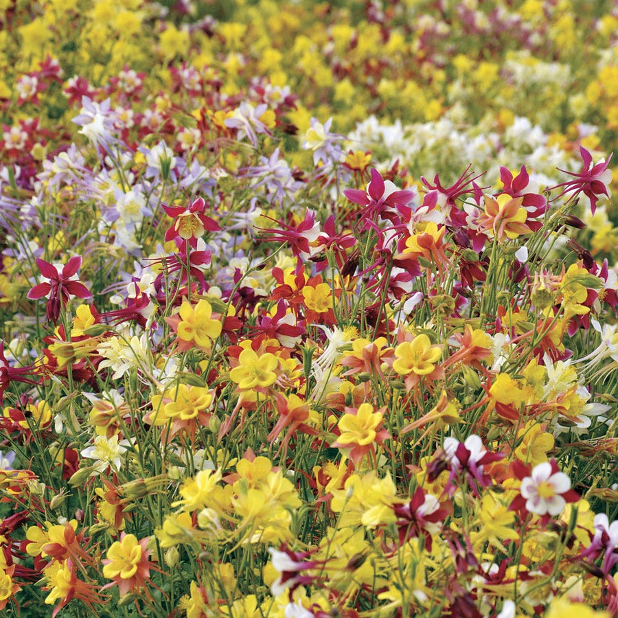 'McKana Giants Mixed' Columbine is a mixture of hybrid perennials offering spring to summer interest. Free flowering, the plants set large, bell-shaped blooms in a wide range of vibrant colors, including bicolors in various combinations of white, yellow, pink, red, purple, light blue, and midnight blue. Borne on strong stems, the long-spurred flowers attract hummingbirds to the garden and are ideal for cutting.