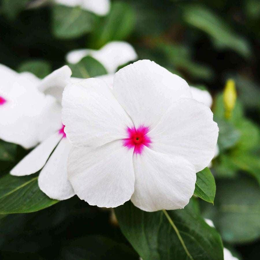 A Catharanthus roseus cultivar, commonly called periwinkle, Mega Bloom Polka Dot Vinca has a compact, upright, mounded habit of glossy, dark green foliage and a vigorous growth rate. The plants are highly uniform and remain neat and tidy with healthy foliage all season. They are often used as ground cover or edging in beds and borders, but they also make wonderful potted plants.