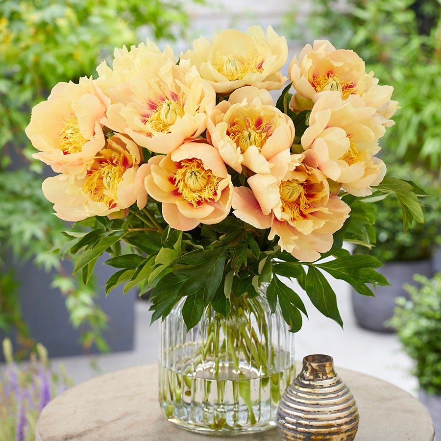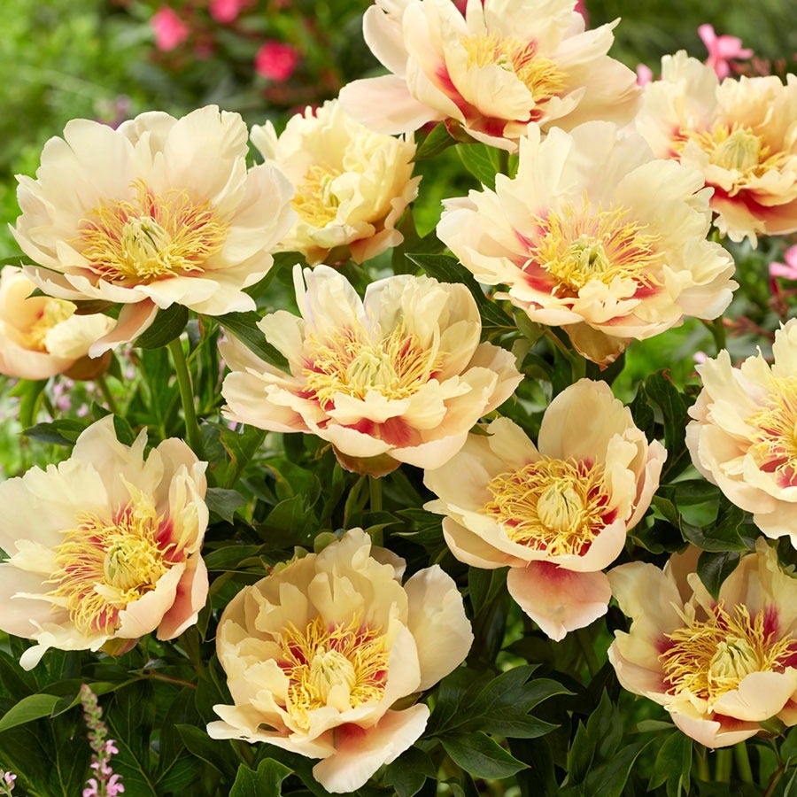 'Prairie Charm' is an Itoh or intersectional peony, a rare cross between a tree peony and an herbaceous peony. Compact yet impactful, this peony enhances mixed beds, borders, and even patio gardens. For a bold statement, group them to form a colorful hedge or pair them with spring bulbs for a vibrant display. Exceptionally hardy to Zones 3-8, 'Prairie Charm' can thrive for decades in the right conditions.
