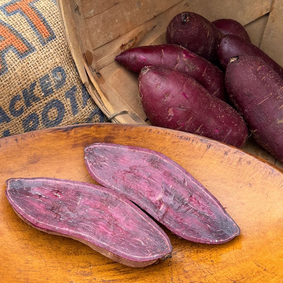 This root vegetable, with its elongated, tapered tubers, develops in late summer to early fall. Unlike the familiar orange sweet potato, Purple Majesty features vibrant deep purple skin and flesh that holds its color beautifully through cooking. Its moderately dry, sweet flesh is perfect for roasting and pairs well with Murasaki and orange varieties for a visually stunning, nutrient-packed side dish. Sweet potatoes are renowned as a superfood, providing excellent amounts of vitamin A, vitamin C, dietary fiber, and potassium, along with iron, calcium, protein, and essential amino acids. The purple variety is also rich in anthocyanins and antioxidants.