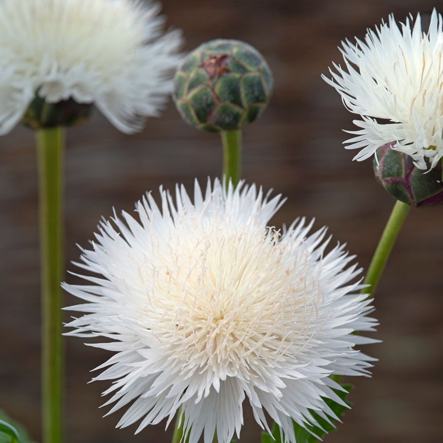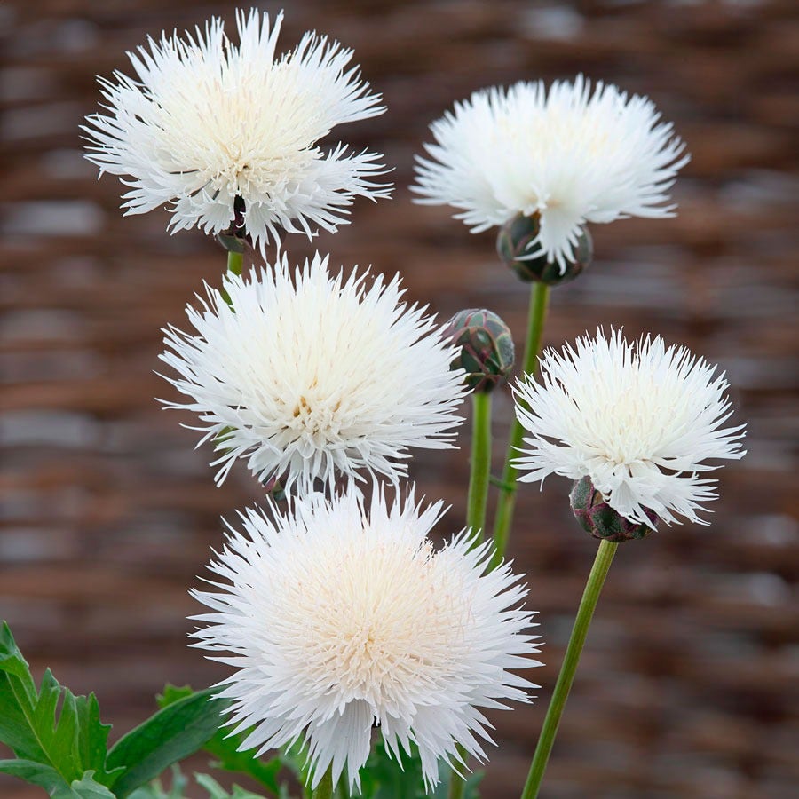 The Bride Cornflower is a flowering annual that grows to a mature height of 36 to 40 inches tall and blooms from midsummer through fall. Borne singly on tall, strong, unbranched stems, the extra-large, fringy flowers are pure white and wonderfully sweet-scented, smelling of vanilla and white chocolate. Pollinator friendly, the nectar-rich flowers attract bees, butterflies, hummingbirds, and beneficial insects to the garden. They make attractive, long-lasting cut flowers for summer bouquets, and they can be dyed to a desired color or dried for potpourri or everlasting arrangements.