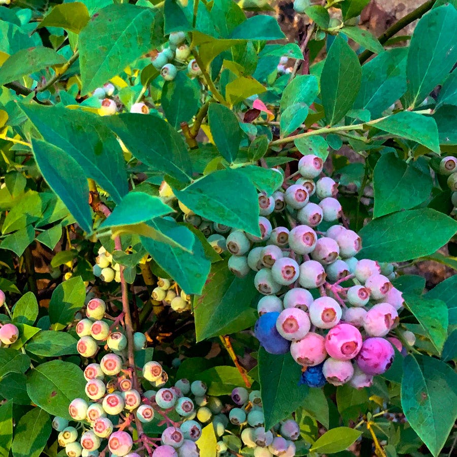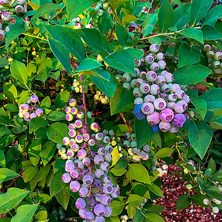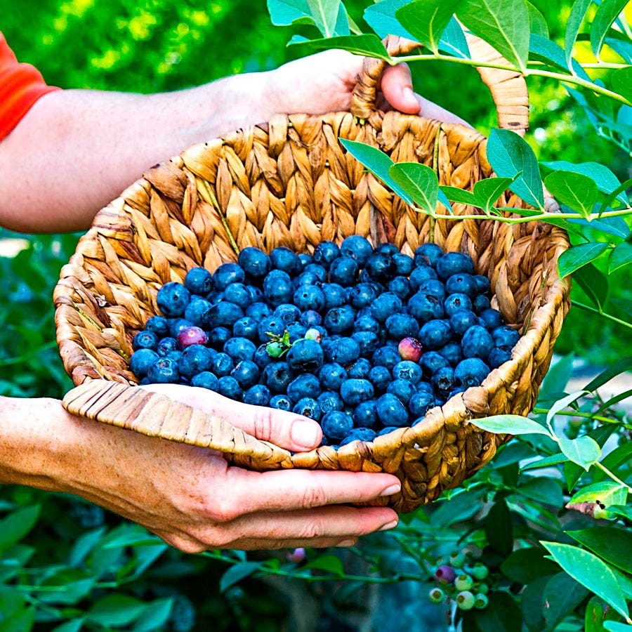 - Description / Vaccinium DownHome Harvest® Takes the Cake™ Blueberry- Vaccinium Takes the Cake Rabbiteye Blueberry, a standout Southern Living® variety from the DownHome Harvest® Collection, has been rigorously tested for greater vigor and higher yields of larger, flavorful fruits. This improved variety makes home growing easier than ever, especially in the Southeast where Vaccinium ashei species, native to the region, thrive in heat and humidity. - Blueberry bushes are attractive plants that integrate beautifully into edible landscapes. Takes the Cake grows at a moderate rate with a compact, upright habit, reaching about 4 to 5 feet tall and 3 to 4 feet wide. The plant blooms late, setting pretty white flowers that avoid frost damage, and ripens quickly, consistently producing heavy yields of large, firm berries with excellent color, sweet flavor, and a long shelf life. Throughout the season, the bush attracts pollinators like butterflies and birds, and in the fall, it transforms with brilliant shades of red and orange. Ideal for group or mass plantings, Takes the Cake is perfect for woodland gardens, hedges, and screens. It also thrives in containers or mixed beds and borders, alongside perennials. Ensure plants have adequate space for healthy root development. - For the best fruiting and color, plant blueberries in sunny spots with consistently moist, well-draining, acidic soil, with a pH of 4.5 to 5.2. Takes the Cake is disease and pest resistant. Fertilize plants in the spring and prune them after fruiting to maintain health and productivity. - While rabbiteye blueberries are self-pollinating, planting two or more varieties with similar bloom times encourages cross-pollination, leading to larger yields and bigger berries. Additionally, planting early, mid-season, and late-fruiting varieties extends the blueberry season from early June through the end of summer. - With its superior fruit quality and ease of care, Takes the Cake Rabbiteye Blueberry is a must-have for any garden, providing delicious berries and stunning ornamental appeal.
