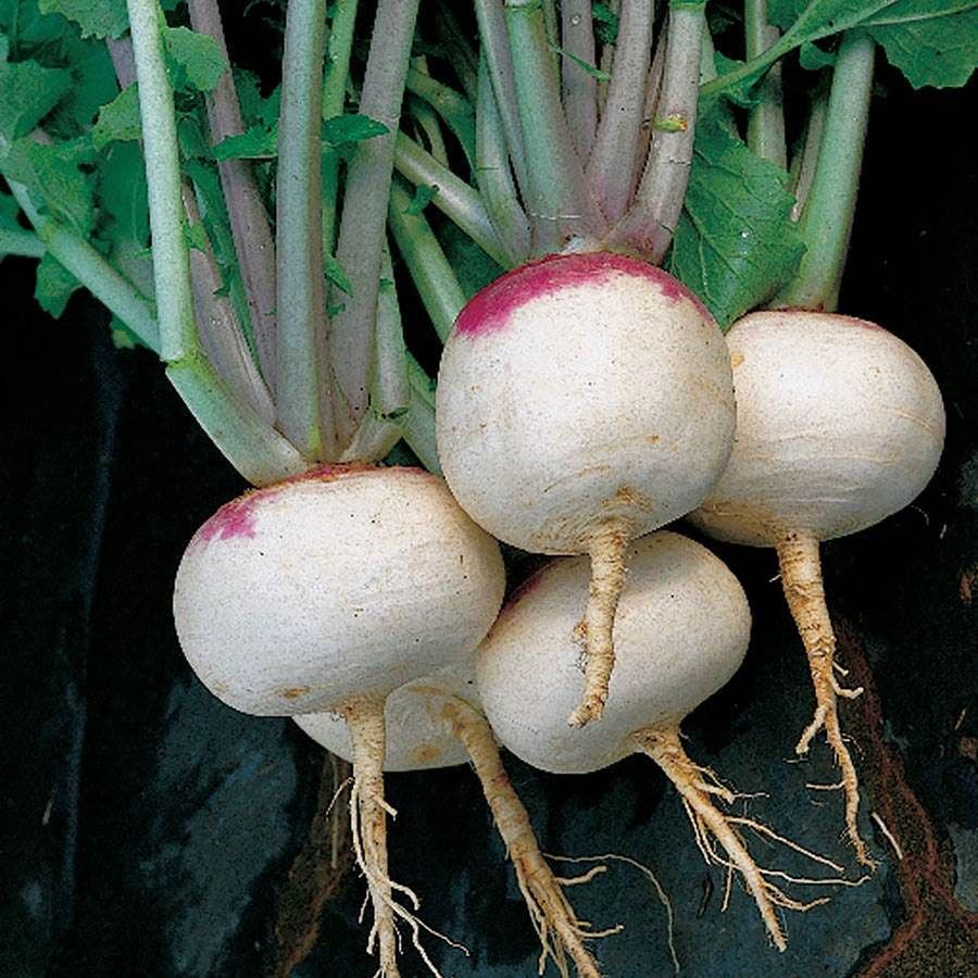 Purple Top White Globe takes its name from the look of its roots. Round and smooth, they are pure white underground, with the aboveground shoulders turning lavender. Very attractive.
