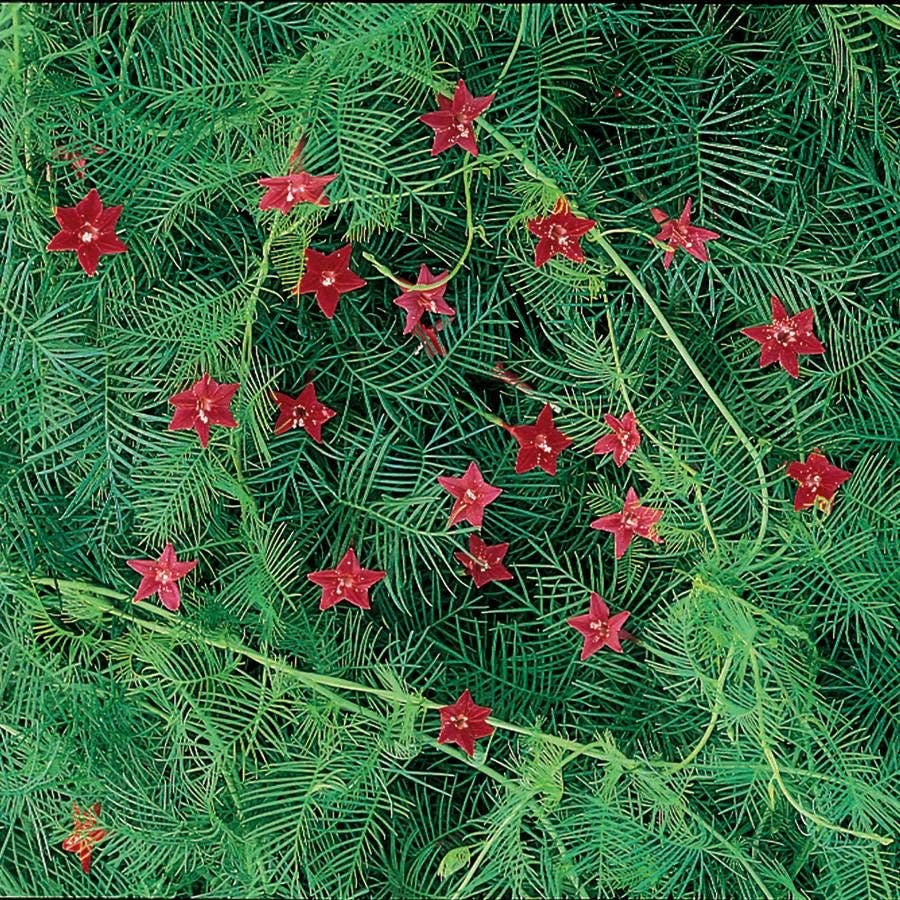 Easy to grow, this vigorous 12- to 25-foot vine simply erupts with 3 to 4 months of bright blooms! Cypress Vine is the perfect screen, with lacy, fern-like foliage elegant enough for the patio yet dense and lush, for superb coverage. The rich red blooms form neat, 5-pointed stars with long trumpet-shaped throats, studded among the foliage like jewels.