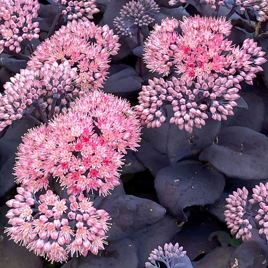 Sedum Mojave Jewels™ 'Sapphire' Stonecrop is a succulent, herbaceous perennial offering 3 seasons of interest, blooming in late summer through early fall. This sedum offers a unique color combination that is simply stunning. Spiraling open from green buds and quickly turning bright pink, the large clusters of dainty flowers pop against a backdrop of fleshy, deep-purple-blue foliage. And the more sun it gets, the darker the color will be. The blooms attract bees and butterflies to the garden and make excellent cut flowers for floral displays indoors.