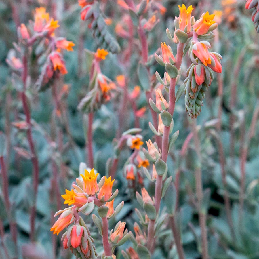 Urban Orange Echeveria is a very slow-growing evergreen succulent plant that maintains its small size even at maturity. Echeveria is a very attractive architectural plant that forms a low-growing rosette of thick, fleshy powdery blue-grey leaves with red edges and tips. Borne on long stems, drooping bell-shaped orange flowers appear in late spring or early summer, attracting bees, butterflies, and hummingbirds.